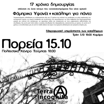 Οι καταλήψεις για εμάς από την αρχή αποτελούν ρήξη με τον κόσμο της εξουσίας και της καταστολής. Αποτελούν εδάφη απελευθερωμένα από τα δεσμά της εξουσίας, χωρίς κανόνες και νόμους, όπου η καθεμία από εμάς μπορεί να εκφραστεί ελεύθερα, να δημιουργήσει, να διασκεδάσει, να αισθανθεί, να ζήσει έξω και ενάντια στη κυρίαρχη κανονικότητα που έχει επιβληθεί από την εξουσία. Γι' αυτό και οι καταλήψεις δεν είναι κάτι ξεπερασμένο. Δε θα αποτελέσουν μια εικόνα του παρελθόντος. Θα παραμείνουν ζωντανές και παρούσες στις στιγμές αγώνα του παρόντος. Θα είναι εδώ να περιμένουν όσους και όσα θα έρθουν. Υπερασπιζόμαστε αδιάλλακτα ως συλλογικότητα εδώ και σχεδόν 17 χρόνια την επιλογή της κατάληψης ως μέσο οργάνωσης του αντικρατικού αγώνα, ως σημείο αναφοράς και συνάντησης των αγωνιζόμενων, ως τόπο έκφρασης και δημιουργικότητας μακριά και ενάντια στο εμπόρευμα, ως ορμητήριο ρήξης και σύγκρουσης με τους μηχανισμούς καθυπόταξης της ελευθερίας. Και αυτό γιατί πολύ απλά, οι ανάσες ελευθερίας δεν εξαγοράζονται, κατακτιούνται με αγώνες.