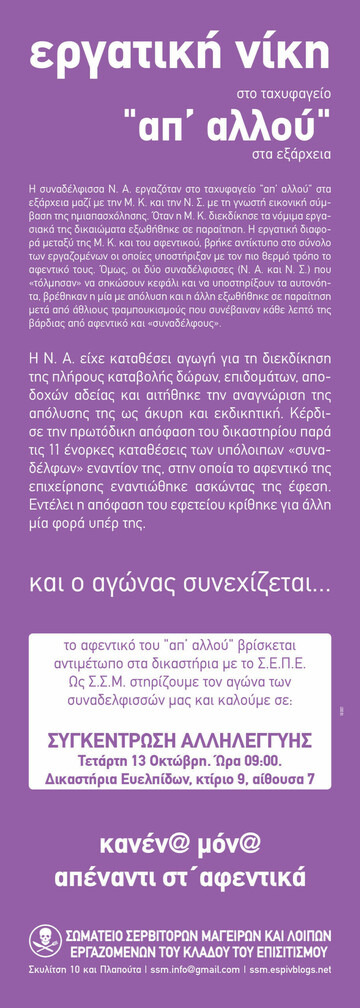 Η συναδέλφισσα Ν. Α. εργαζόταν στο ταχυφαγείο απ' αλλού στα εξάρχεια μαζί με την Μ. Κ. και την Ν. Σ. με την γνωστή εικονική σύμβαση της ημιαπασχόλησης. Απολύθηκε εκδικητικά από το αφεντικό της επιχείρησης Χ. Χαλβατζόγλου καθώς «τόλμησε» να υπερασπιστεί τα δίκαια αιτήματα της συναδέλφισσάς της Μ. Κ.
