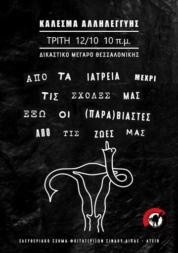 Η δίκη του παραβιαστή καθηγητή - γυναικολόγου συνεχίζεται αυτήν την Τρίτη (12/10) στις 10 π.μ. στο Δικαστικό Μέγαρο Θεσσαλονίκης. Θα βρισκόμαστε όλες και όλοι εκεί, για μια ακόμη φορά, δίπλα στο πλευρό των καταγγελουσών.
