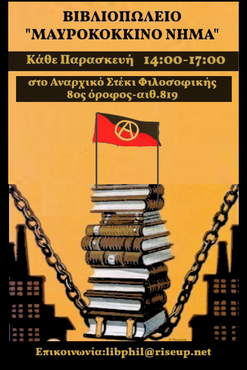 Λειτουργία Βιβλιοπωλείου Μαυροκόκκινου Νήματος για τον μήνα Οκτώβρη. Καθε Παρασκευη από τις 14:00-17:00 στο Αναρχικο Στέκι Φιλοσοφικής. Μπορείτε να βρείτε τους τίτλους που διατίθενται στο βιβλιοπωλείο στον παρακάτω σύνδεσμό: https://steki-fls.espivblogs.net/vivliopoleio…
