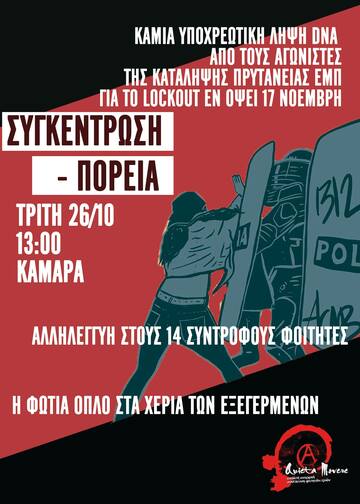 Τον τελευταίο μήνα, 14 αγωνιστές φοιτητές λαμβάνουν κλήση υποχρεωτικής λήψης γενετικού υλικού στην ΓΑΔΑ. Οι σύντροφοι είχαν συλληφθεί κατά την εκκένωση της πρυτανείας ΕΜΠ στις 13/11/2020. Η σύλληψη αυτή οφείλεται στην συμμετοχή των ατόμων στην κατάληψη του διοικητικού κτηρίου πρυτανείας ΕΜΠ στις 12/11/2020 στο πλαίσιο του αγώνα ώστε να διεξαχθούν οι εκδηλώσεις μνήμης - διαδηλώσεις για τις 17 Νοέμβρη και να διασφαλιστεί η παρουσία κόσμου στο κάτω πολυτεχνείο, πάρα το καθεστώς απαγόρευσης που επέβαλλε το κράτος με πρόσχημα τον COVID - 19 , εκείνες τις μέρες. Στις 13/11/2020 γίνεται εισβολή των μπάτσων (ΜΑΤ, ΔΡΑΣΗ, ΟΠΚΕ, ΕΚΑΜ) τόσο στο κάτω πολυτεχνείο, συλλαμβάνοντας δεκάδες ατόμων, όσο και στην πρυτανεία του ΕΜΠ προχωρώντας σε άλλες 25 συλλήψεις.