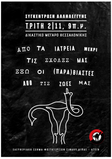 Στις 02/11 η δίκη του παραβιαστη καθηγητή μαιευτικής συνεχίζεται και εμείς με την σειρά μας στεκόμαστε αλληλέγγυες/οι στις καταγγέλλουσες αυτού και στον αγώνα τους ενάντια στο καθεστώς της εμφυλης βίας, της κουλτούρας του βιασμού και γενικότερα της πατριαρχίας που ολόκληρο το σύστημα ξεπλένει και αναπαράγει. Καλούμε λοιπόν σε συγκέντρωση αλληλεγγύης την Τρίτη 02/11 στις 9:00 π.μ. στο Δικαστικό Μέγαρο Θεσσαλονίκης στις απόφοιτες του τμήματος μαιευτικής Σίνδου που παρενοχληθηκαν σεξουαλικά κατά την διάρκεια γυναικολογικής εξέτασης από τον γυναικολόγο - καθηγητή του.
