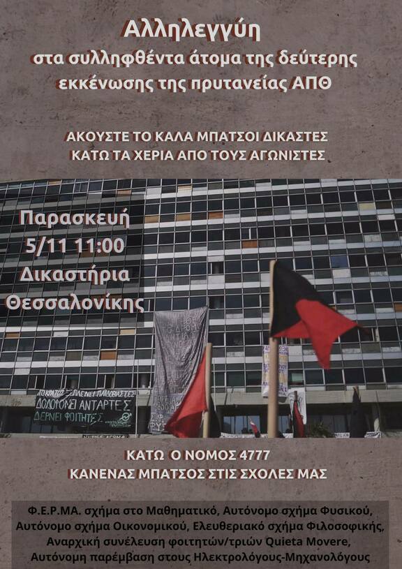 Συγκέντρωση Αλληλεγγύης στα Δικαστήρια Θεσσαλονίκης, Παρασκευή 5/11 στις 11:00