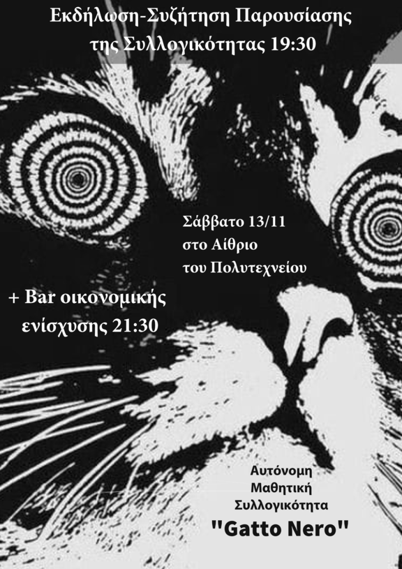 Στην εκδήλωση θα γίνει παρουσίαση της Α.Μ.Σ. "Gatto Nero" και συζήτηση γύρω από την εκπαιδευτική πραγματικότητα και τον, από τα κάτω, αγώνα των μαθητών. Στη συνέχεια θα πραγματοποιηθεί bar οικονομικής ενίσχυσης της συλλογικότητας.