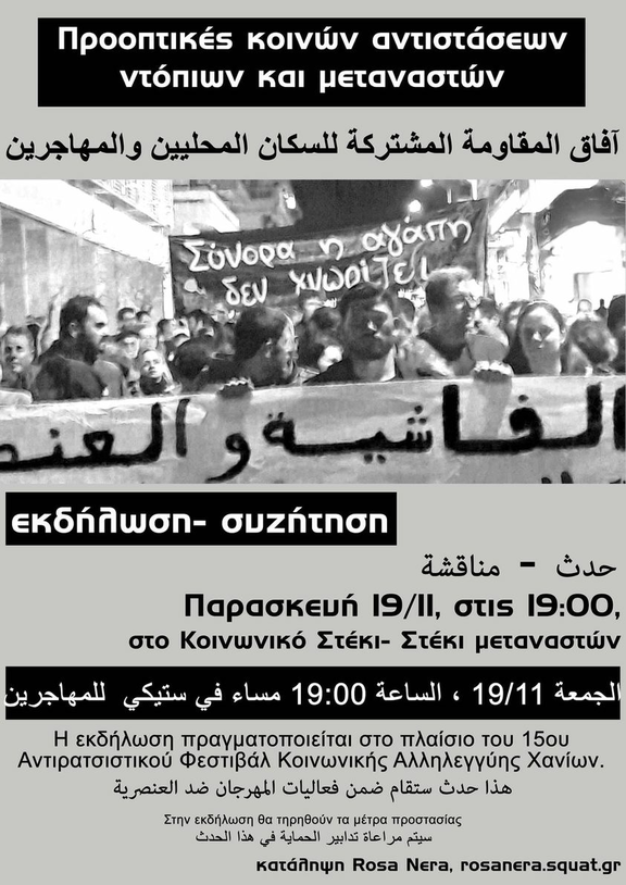 Εκδήλωση από την Κατάληψη Rosa Nera, στο πλαίσιο της υποστήριξης του Αντιρατσιστικού Φεστιβάλ Χανίων και του Κοινωνικού Στεκιού - Στεκιού Μεταναστών: