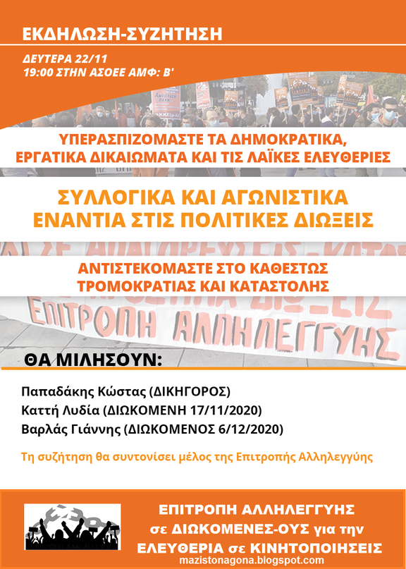 Η Επιτροπή Αλληλεγγύης σε διωκόμενες-ους για την ελευθερία σε κινητοποιήσεις σας καλεί σε συζήτηση που οργανώνει τη Δευτέρα 22/11/2021 στις 7 μμ με θέμα : «Αντιστεκόμαστε στο καθεστώς τρομοκρατίας και καταστολής. Συλλογικά και αγωνιστικά ενάντια στις πολιτικές διώξεις υπερασπιζόμαστε τα δημοκρατικά, εργατικά δικαιώματα και τις λαϊκές ελευθερίες.»