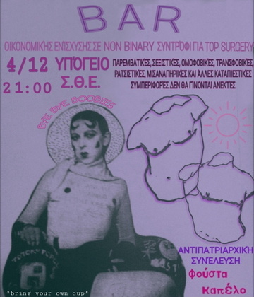 Έτσι και εμείς διοργανώνουμε συλλογικά το bar αυτό, με στόχο την οικονομική ενίσχυση του ατόμου για τα έξοδα της ακριβής αυτής επέμβασης, αφού θεωρείται χειρουργείο αισθητικής και δεν καλύπτεται οικονομικά με κανένα τρόπο από το ελληνικό κράτος, χωρίς βέβαια να περιμέναμε κάτι από αυτό. Αντίθετα, στεκόμαστε το ένα δίπλα στο άλλο, υλικά, πολιτικά και ψυχικά, δημιουργώντας φροντιστικά χώρους που να μας χωράνε όλα.