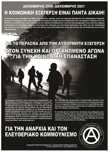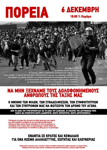 Στις 6/12/2008 ο 15χρονος αναρχικός μαθητής Αλέξανδρος Γρηγορόπουλος δολοφονείται εν ψυχρώ από τον ειδικό φρουρό Ε. Κορκονέα μαζί με τον Β. Σαραλιώτη. Άμεσα, το Κράτος και τα ΜΜΕ επιχείρησαν να αποσιωπήσουν και να αποκρύψουν το γεγονός της δολοφονίας ή να το παρουσιάσουν ως «μεμονωμένο περιστατικό». Η δολοφονία του Α. Γρηγορόπουλου στις 6/12/08 πυροδότησε συγκρούσεις στο κέντρο των μητροπόλεων και έδωσε το έναυσμα για ανυπακοή, αυτοδιεύθυνση και αντιπαράθεση με το κράτος, τους θεσμούς και τους φύλακές τους. Σίγουρα ο Δεκέμβρης του '08 αποτέλεσε σημαντικό σημείο της σύγχρονης ιστορίας και ιδιαίτερα του αναρχικού κινήματος. Τότε φάνηκαν έντονα για μία ακόμη φορά τα σαθρά θεμέλια του σάπιου αυτού κόσμου. Ο Δεκέμβρης αποτελεί σπουδαία παρακαταθήκη για τους σημερινούς μας αγώνες και έχει χαράξει τον δρόμο για την κοινωνική επανάσταση.