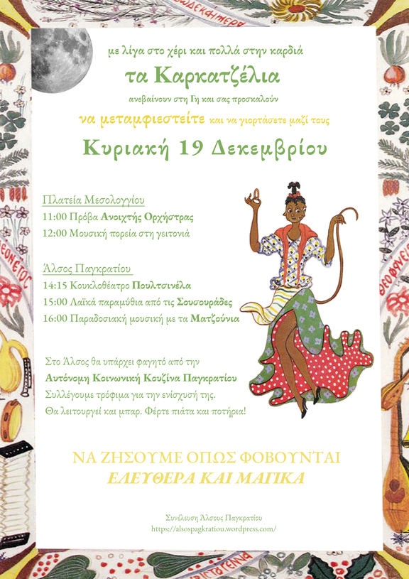 Δεν περνάμε κι άσχημα εδώ κάτω είν' η αλήθεια, αλλά όποτε παίρνει να ξαναμεγαλώνει η μέρα των απάνω μάς πιάνει κι εμάς να σεργιανίσουμε και να ξεδώσουμε λιγάκι. Να, λίγο κρασάκι από το φρέσκο της χρονιάς, κανάς χορός κάτω απ' τ' αστέρια όταν σβήνει το φεγγαρόφωτο, τίποτα πιατικά σπασμένα από μόνα τους, γυαλιά που εξαφανίζονται από τις μύτες τους, γράμματα που μπερδεύουν τους παραλήπτες τους, απλά πράγματα θέλει η καλοπέραση η καρκατζέλικη.