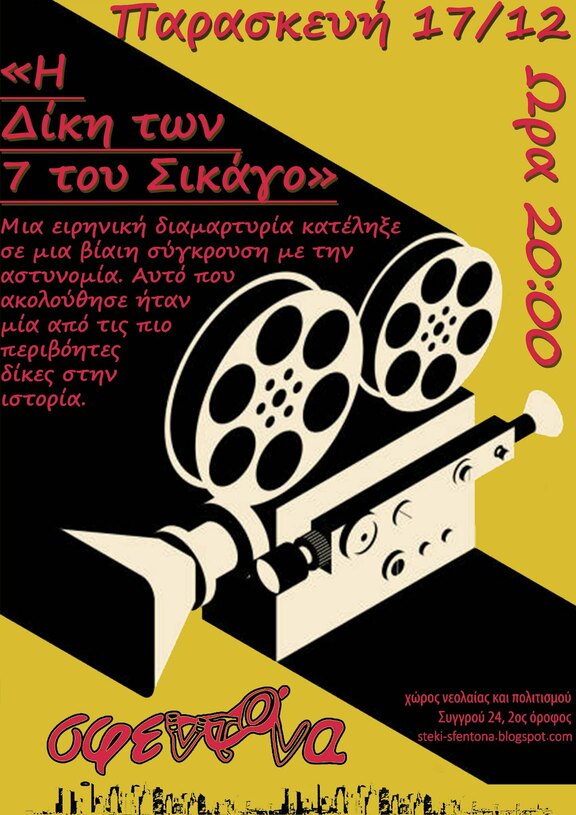 Το Στέκι Σφεντόνα (Συγγρού 24) σας περιμένει την Παρασκευή 17/12, στις 20:00 για προβολή της ταινίας "Η δίκη των 7 του Σικάγο"!
