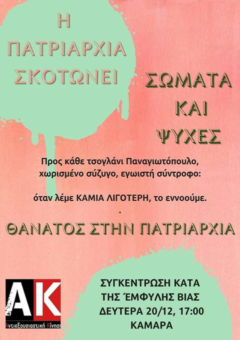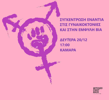 Συμμετέχουμε στη συγκέντρωση ενάντια στις γυναικοκτονίες και στην έμφυλη βία την Δευτέρα 20/12 στις 17:00 στη Καμάρα!