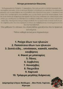 Πανιά: 23/12/2021 18:30-20:30, 07/01/2022 18:30-20:30 τις ίδιες μέρες και ώρες θα μπορείτε να φέρνετε πράγματα πρώτης ανάγκης για τους μετανάστες στο κέντρο μεταναστών Ελαιώνας που έχουν μεγάλη ανάγκη μετά την πρόσφατη εκεί πυρκαγιά.