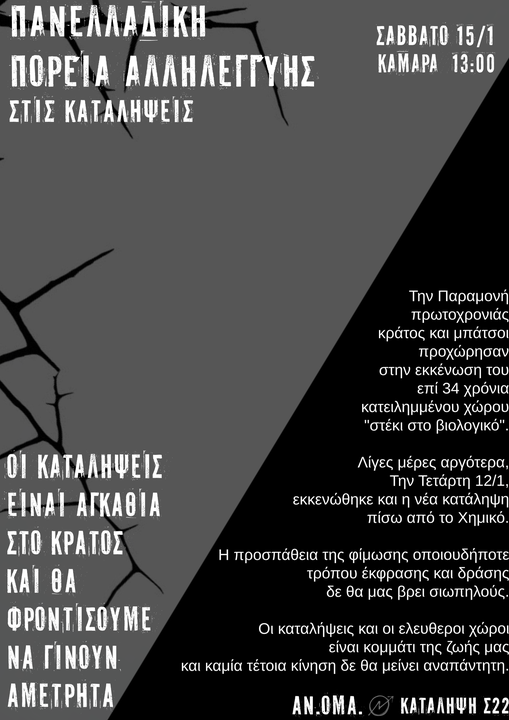 Όλοι και όλες στην πορεία αλληλεγγύης στις καταλήψεις & υπεράσπισης του στεκιού στο βιολογικό