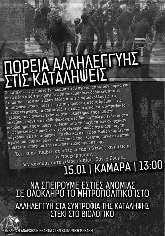 Οι καταλήψεις αποτελούν κομμάτι του αγώνα, το έδαφος όπου προετοιμάζονται τα σχέδια της κοινωνικής και ταξικής αντεπίθεσης και για αυτό πρέπει να χτυπηθούν, στο πλαίσιο της «προληπτικής αντιεξέγερσης» για να μην βρουν κοινωνικές προσβάσεις να μην έρθουν σε ώσμωση με την διογκούμενη οργή των πληβειακών μαζών, ιδιαίτερα σε μια περίοδο όπου τα προτάγματα του αναρχικού αγώνα είναι τα μόνα που μπορούν να δώσουν μιαν απάντηση στη βάρβαρη πραγματικότητα που βιώνουμε. Αλληλεγγύη, αυτοοργάνωση και αλληλοβοήθεια. Όπως λοιπόν απέτυχαν και οι προηγούμενες κατασταλτικές ενέργειες τους θα αποτύχουν και αυτές οι τωρινές. Η έντονη και διαρκής παρουσία των αναρχικών αγωνιστών σε όλα τα μέτωπα πάλης, η σύνδεσή τους με τους κοινωνικούς αγώνες, η συμμετοχή της νεολαίας, των φοιτητών και των μαθητών, των νέων εργαζόμενων, των ανθρώπων με αξιοπρέπεια σε αναρίθμητα εγχειρήματα του αναρχικού και αντικρατικού αγώνα έχουν διαμορφώσει ένα αγωνιστικό υποκείμενο το οποίο διεκδικεί χωρίς να παρακαλά κανέναν, επιτίθεται χωρίς να μεμψιμοιρεί. Και ως σχέση δεν καταστέλλεται. Το αναρχικό κίνημα γεννήθηκε μέσα από σχέσεις αμοιβαίας κοινωνικής αλληλοβοήθειας, αναπτύχθηκε και ενέπνευσε με το όπλο της -δίχως προϋποθέσεις και όρους- αλληλεγγύης και αυτό παραμένει το ιδανικό και ο προσανατολισμός του για την κοινωνία που οραματίζεται.