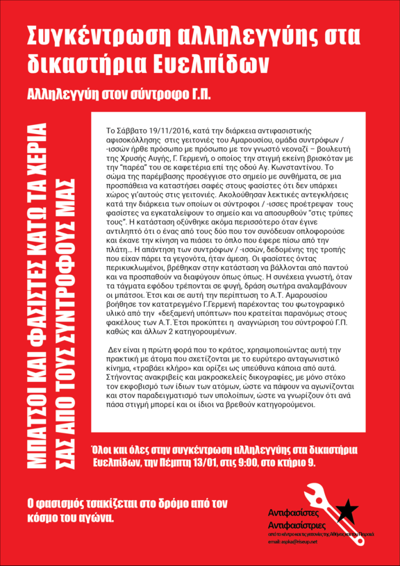 Συγκέντρωση αλληλεγγύης στα δικαστήρια. Ο φασισμός τσακίζεται στο δρόμο από τον κόσμο του αγώνα. Αλληλεγγύη στον σύντροφο Γ.Π. Όλοι και όλες στην συγκέντρωση αλληλεγγύης στα δικαστήρια της Ευελπίδων, την Πέμπτη 13/01, στις 9:00, στο κτήριο 9.