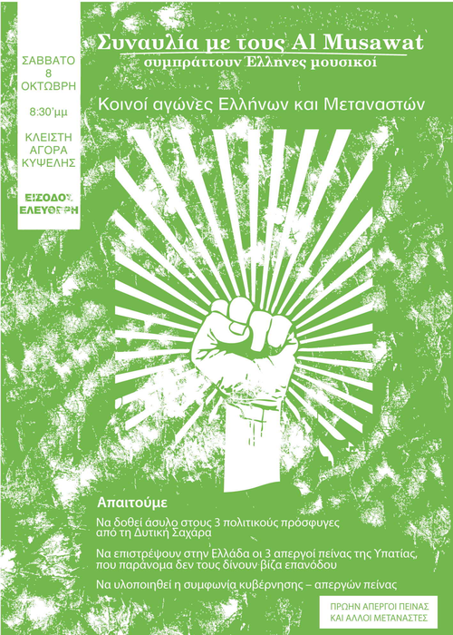 Τρία αιτήματα κυριαρχούν στο κάλεσμα που κάνουν οι πρώην απεργοί πείνας της Υπατίας και άλλοι μετανάστες, για την εκδήλωση που διοργανώνουν στην Κλειστή Αγορά Κυψέλης, το Σάββατο 8 Οκτώβρη.