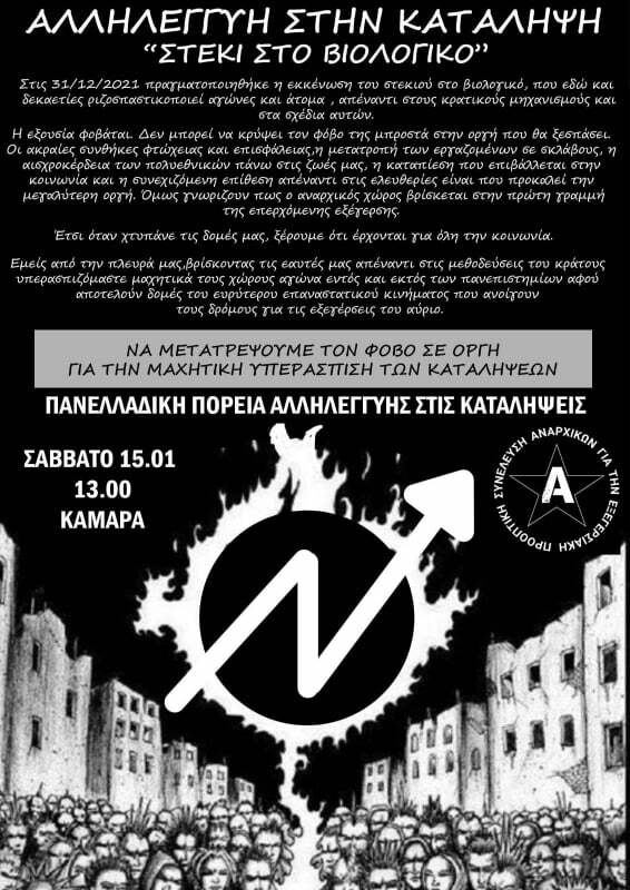 Παραμονή πρωτοχρονιάς το κράτος, σε μια κατάσταση που οι νοσούντες της πανδημίας άγγιζαν πρωτοφανείς αριθμούς, απεφάνθη ότι η εκκένωση του στεκιού στο Βιολογικό είναι μια καλή επιλογή καθώς με την άριστη σύμπνοια πρυτάνεων, κοσμητόρων, ΜΜΕ θα περνούσε στα ψιλά γράμματα. Οι κρατικοί διαχειριστές, λοιπόν, σε μια προσπάθεια να παραλύσουν καταλυτικά τον κόσμο του αγώνα πυκνώνουν όλο και παραπάνω το σχέδιο της αντι-εξέγερσης, όσο κατά εκατοντάδες στοιβάζονται στα νοσοκομεία, όσο οι κεφαλαιούχοι βιαστές ξεπλένονται σαν αχνός λεκές και όσο τοκογλύφοι παιδεραστές διατηρούν έδρες στην ΑΣΟΕΕ. Είμαστε σθεναρά απέναντι τους, μέχρι την έλευση της αναρχίας, οι καταλήψεις είναι εργαλεία του αγώνα μας ενάντια στην καταπίεση και στην εκμετάλλευση, εδάφη δημιουργίας και αντίστασης. Έπειτα την πανελλαδική πορεία στις 15/01 των 1.500 ανθρώπων, ο κρατικός εσμός των δυνάμεων καταστολής προχώρησε στην σύλληψη 23 διαδηλωτών/-τριών σε όλο το εύρος του κέντρου.