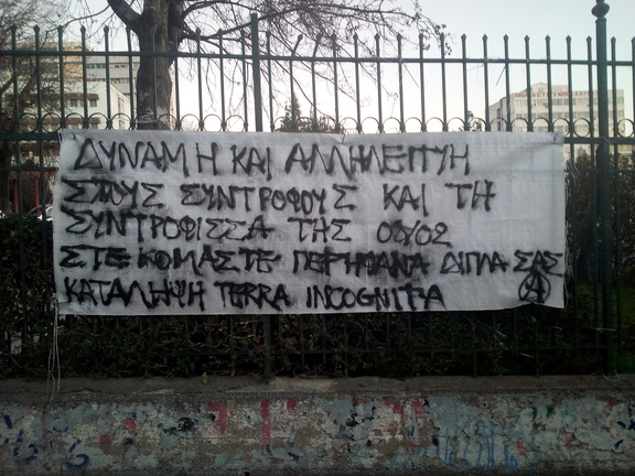 Ως αναρχικές/οι έχουμε το χρέος απέναντι στους ίδιους μας τους αγώνες, απέναντι στην ίδια την πολιτική μας ύπαρξη να μην εγκαταλείπουμε ο ένας την άλλη ακόμη και όταν οι καιροί δυσκολεύουν. Οι ιδέες μας και οι δεσμοί μας θα είναι για πάντα ένα όπλο που δεν θα μπορέσουν ποτέ να κατανοήσουν. Δεν αφήνουμε καμιά/κανέναν μόνη/ο στα χέρια της εξουσίας. Γιατί μόνο όταν θα περπατήσουμε όλοι και όλες μαζί πάνω στα συντρίμμια του γερασμένου αυτού κόσμου, πορευόμενοι/ες προς μια επαναστημένη κοινωνία με τις δικές μας αξίες και ιδανικά, θα είμαστε ελεύθεροι/ες.