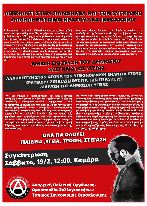 Ενώ περισσότεροι από 22.000 άνθρωποι έχουν χάσει τη ζωή τους από την πανδημία σε όλη τη χώρα ως αποτέλεσμα της μεθοδικής εγκατάλειψης και συρρίκνωσης του δημοσίου συστήματος υγείας (με ελλείψεις σε προσωπικό, υλικό και νοσοκομεία), επιχειρείται αυτή να αξιοποιηθεί ως εργαλείο αντικοινωνικής επιβολής της νεοφιλελεύθερης διαχείρισης ώστε να υλοποιηθούν ταχύτερα και με σκληρότερους όρους οι συνολικές αναδιαρθρώσεις που λεηλατούν την μεγάλη κοινωνική πλειοψηφία και έχουν στόχο τη διασφάλιση και διεύρυνση των προνομίων των οικονομικών και πολιτικών ελίτ.