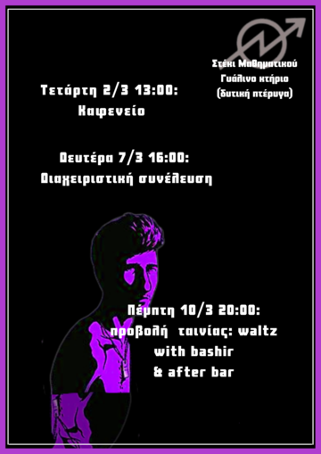 Τετάρτη 2 Μαρτίου, 13:00 καφενείο στο στέκι Μαθηματικού (Δυτική πτέρυγα, γυάλινο κτήριο, ΣΘΕ). Πίνουμε τον καφέ μας και συζητάμε προβληματισμούς και ευρύτερα κοινωνικοπολιτικά ζητήματα.