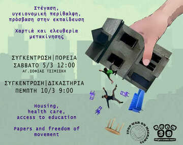 The NGO "DRASEIS KOINONIKIS ALLILEGGIIS" is evicting from her house M., a migrant with two small children, coming from Afghanistan. On Thursday 10/03, after demanded from this NGO, her case of eviction is going to the court, and on Friday 11/03 the same procedure will happen for the interim measures applied against her. Along with all these, the NGO "DRASEIS" also demands the amount of 1.000 euros for every "violation" committed against the final court decision, as well as the coverage of the legal expenses from the migrant herself (!).