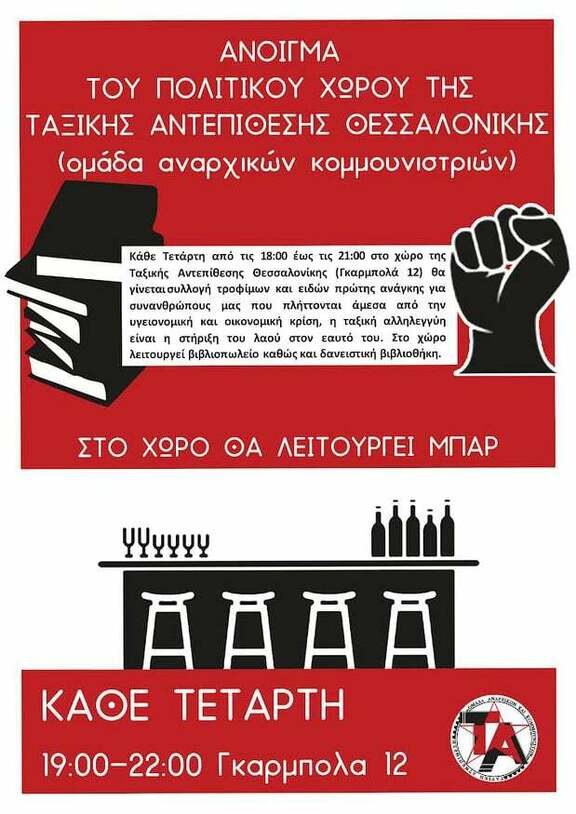 ετάρτη, από τις 19.00 ως τις 21.00 άνοιγμα του πολιτικού χώρου της Ταξικής Αντεπίθεσης Θεσσαλονίκης.
