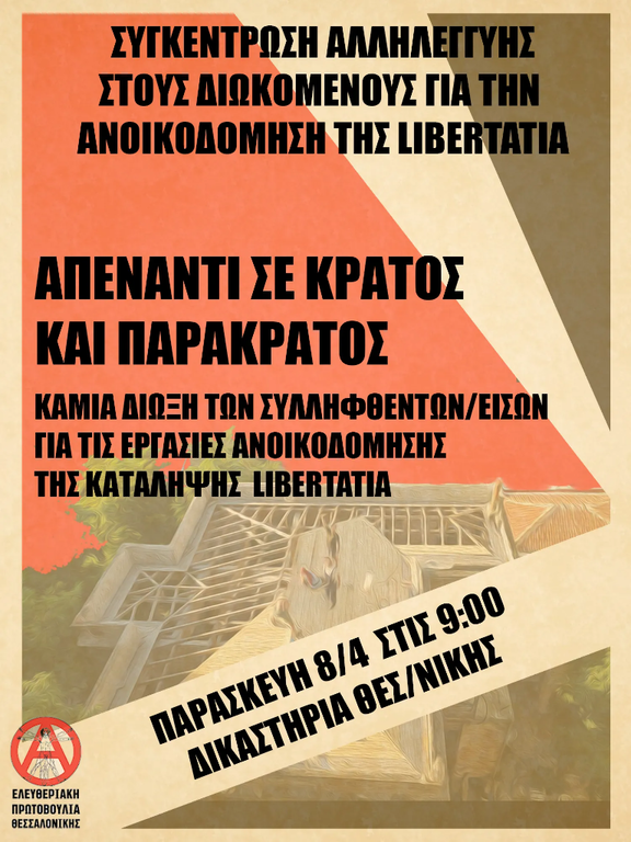 Την Παρασκευή 08.04 στις 09:00 εκδικάζεται η υπόθεσης της ανοικοδόμησης της κατάληψης Libertatia. Τον Γενάρη του 2018 η Libertatia δέχεται επίθεση από ομάδα φασιστών, κατά τη διάρκεια συλλαλητηρίου για τη μακεδονία, με αποτέλεσμα τον εμπρησμό του κτηρίου. Στις 08.11.2019 κατά τη διάρκεια εργασιών επισκευής της κατάληψης, η αστυνομία εισβάλει στο χώρο και συλλαμβάνει 4 άτομα με τις κατηγορίες της «καταστροφής μνημείου πολιτιστικής κληρονομιάς». Εν μέσω διαρκούς κρίσης και επίθεσης του κράτους στις αυτοοργανωμένες δομές αγώνα και τον αυτόνομο τρόπο δράσης, η υπεράσπιση των καταλήψεων είναι για εμάς ζωτικής σημασίας. Για να συνεχίσουμε να υπάρχουμε σε αυτήν την πόλη, να συναντίομαστε μακριά από την εμπορευματική σχέση και να δημιουργούμε ρωγμές στην εξατομικευμένη καθημερινότητα.