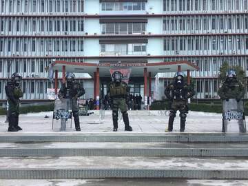 Κατέλαβαν μεγάλο μέρος του campus του πανεπιστημίου και παρεμπόδιζαν φοιτητές, αλλά δημοσιογράφους, ενώ συνέλαβαν έναν φοιτητή που καθόταν στα σκαλιά, χωρίς να κάνει απολύτως τίποτε.