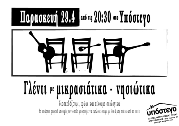 Παρασκευή 29/4 από τις 20:30 στο Υπόστεγο, διασκεδάζουμε με μικρασιάτικα και νησιώτικα, τρώμε και πίνουμε συλλογικά. Θα υπάρχει μπουφές με φαγητά που θα μαγειρέψουμε στο στέκι και θα φέρουμε από το σπίτι.
