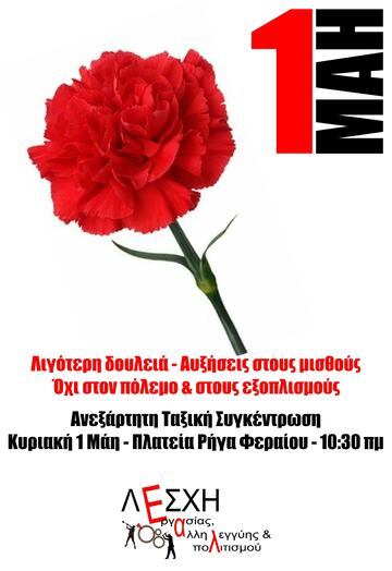 Καλούμε όλες κι όλους στην ταξική συγκέντρωση, στην οποία καλούν εργατικές συλλογικότητες, εργατικά σχήματα και πολιτικές οργανώσεις, την Κυριακή 1η Μάη, στην πλατεία Ρήγα Φεραίου, στις 10:30 π.μ.