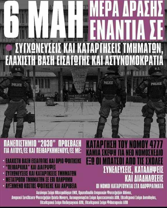 Παρασκευή 6 Μάη- ημέρα δράσης ενάντια στις συγχνωνεύσεις και καταργήσεις τμημάτων, την Ελάχιστη Βάση Εισαγωγής και την αστυνομοκρατία