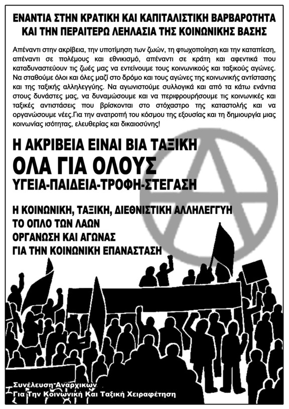 Η επόμενη διαδικασία της Συνέλευσης Αναρχικών για την Κοινωνική και Ταξική Χειραφέτηση θα πραγματοποιηθεί την Πέμπτη 19/5 στις 20.00 στην ΑΣΟΕΕ, μετά την προγραμματισμένη συγκέντρωση- παρέμβαση στην πλ. Βικτώριας στις 18.30 ενάντια στη λεηλασία της κοινωνικής βάσης και την ακρίβεια