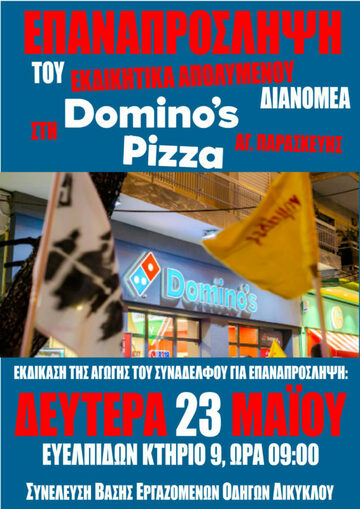 Άμεση επαναπρόσληψη του διανομέα Γιώργου Φ. στη Domino's Pizza Αγίας Παρασκευής.