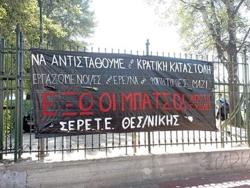 [Φώτο: Αντικατασταλτικό πανό που αναρτήθηκε στις 11 Μάη έξω από την ΣΘΕ]