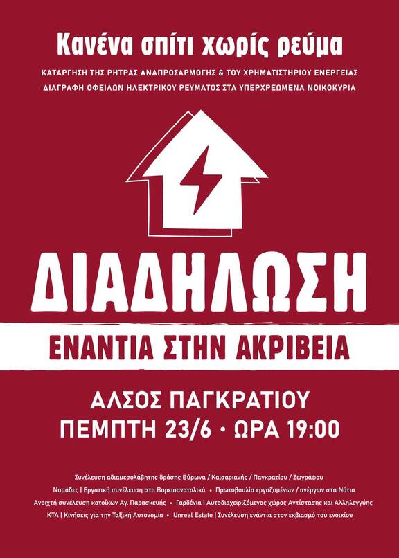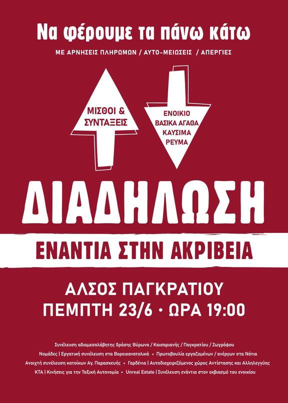 Η Συνέλευση ενάντια στη Βιοεξουσία και την Κλεισούρα θα συμμετάσχει στη διαδήλωση που καλούν ΣΥΛΛΟΓΙΚΟΤΗΤΕΣ / ΕΡΓΑΤΙΚΕΣ ΟΜΑΔΕΣ/ ΣΥΝΕΛΕΥΣΕΙΣ ΓΕΙΤΟΝΙΩΝ και καλεί αύριο ΠΕΜΠΤΗ 23/06, ΩΡΑ 19:00 στο ΑΛΣΟΣ ΠΑΓΡΚΑΤΙΟΥ.