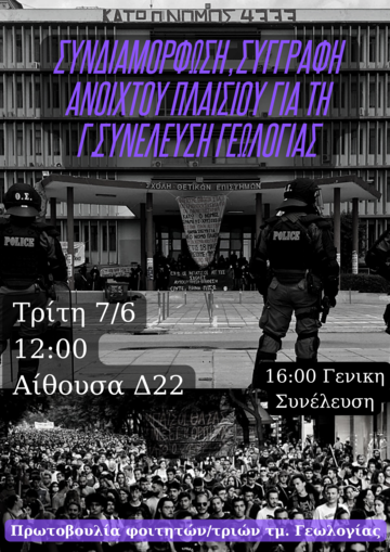 Συνδιαμόρφωση, συγγραφή ανοιχτού πλαισίου για τη Γενική Συνέλευση του τμήματος Γεωλογίας, στις 12:00 στην αίθουσα Δ22(ΣΘΕ).
