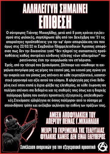 Άμεση απελευθέρωση του αναρχικού Γιάννη Μιχαηλίδη, απεργού πείνας από 23/5/22
