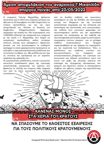 ΑΜΕΣΗ ΑΠΕΛΕΥΘΕΡΩΣΗ ΤΟΥ ΑΝΑΡΧΙΚΟΥ ΓΙΑΝΝΗ ΜΙΧΑΗΛΙΔΗ/ ΑΠΕΡΓΟΥ ΠΕΙΝΑΣ ΑΠΟ 23/5