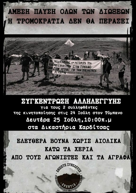 Για τρίτη φορά οι διαδηλώσεις στον Τύμπανο καταστέλλονται. Σήμερα, Κυριακή 24/7/2022, αστυνομικές δυνάμεις επιτέθηκαν με βία σε διαδηλωτές που κινητοποιήθηκαν ενάντια στη μεταφορά και εγκατάσταση ανεμογεννητριών στον Τύμπανο Αργιθέας. Απρόκλητη ήταν η επίθεση της αστυνομίας από την οποία διαδηλωτής κινδύνευσε να πέσει από τον γκρεμό. Προσήγαγαν αναίτια και απρόκλητα έξι άτομα, εκ των οποίων οι δύο συνελήφθησαν και κρατούνται στο αστυνομικό τμήμα Καρδίτσας. Η αστυνομική βία συνεχίστηκε και μετά τις προσαγωγές. Στην αυθαιρεσία των επενδυτών που αποσκοπεί στην κερδοφορία τους με αντίκτυπο την καταστροφή των Αγράφων, το κράτος στέκεται αρωγός και επιτίθεται κάθε φορά και με περισσότερο μένος σε όσους υπερασπίζονται τα βουνά μας. Δεν είναι τυχαίο ότι οι διωκόμενοι συναγωνιστές μας διώκονται και ξαναδιώκονται από προηγούμενες κινητοποιήσεις στο Δημαρχείο και στον Τύμπανο και εκκρεμούν εις βάρος τους δίκες για το προσεχές φθινόπωρο. Στοχευμένα προσπαθούν να μας πτοήσουν, αλλά ο αγώνας μας για γη και ελευθερία υπερέχει μέχρι να νικήσουμε.