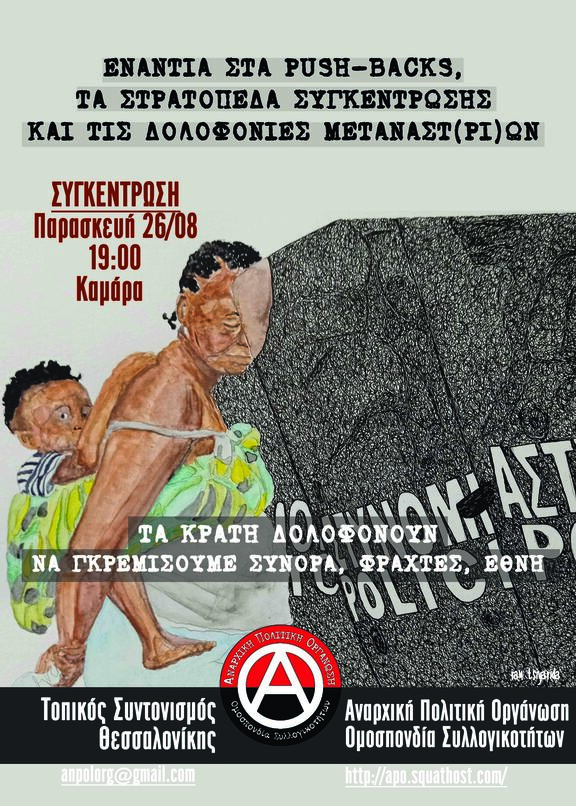 Το ελληνικό κράτος με την αρωγή του τουρκικού δολοφονεί στον Έβρο, ξυλοκοπεί στον Ελαιώνα και βασανίζει στα αστυνομικά τμήματα. Επαναπροωθει ανθρώπους στα σύνορα, στέλνοντας τους στην κόλαση ή στον θάνατο. Η αντιμεταναστευτικη πολιτική αποτελεί ένα διαρκές έγκλημα.