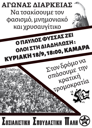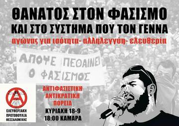 Εννέα χρόνια έκλεισαν από την μέρα της δολοφονίας του αντιφασίστα Παύλου Φύσσα από την φασιστική οργάνωση Χρυσή Αυγή. Η 18η Σεπτέμβρη είναι η μέρα όπου τα ριζοσπαστικά κομμάτια των αγωνιζόμενων επιλέγουν να βγαίνουν στον δρόμο όχι μόνο ενάντια στην χρυσή αυγή, όχι μόνο ενάντια στους οργανωμένους φασίστες, αλλά ενάντια στον κοινωνικό εκφασιμό, στους αποκλεισμούς, στο κράτος, στο σύστημα που γεννά τον φασισμό, που δεν είναι άλλο από τον ίδιο τον καπιταλίσμό. Στην αρχή του ίδιου έτους, στις 17 Ιανουαρίου του 2013, φασίστες της χρυσής αυγής δολοφόνησαν τον 27χρονο Πακιστανό εργάτη Σαχζάτ Λουκμάν. Έχουν περάσει 9 χρόνια από το περιστατικό της δολοφονίας αντιφασίστα και από τη δολοφονία Πακιστανού εργάτη, στα οποία αναδύθηκαν και οξύνθηκαν θεμελιώδεις αντιθέσεις αυτής της κοινωνίας. Το ελληνικό κράτος χρόνο με το χρόνο απομακρύνει τον όποιον ανθρωπιστικό του μανδύα και εμφανίζει την πραγματική του υπόσταση. Συγκροτεί, θεμελιωδώς, την εθνική του ενότητα μέσα από το γνωστό τρίπτυχο εθνικισμού, πατριαρχίας και θρησκείας, μέσω του οποίου γαλουχεί γενεές πολιτών, ανεξαρτήτου κυβέρνησης, με τη δράση του σε αυτή την κατεύθυνση να είναι ολοένα και πιο κλιμακούμενη. Η ακραία έκφανση της πολεμικής του είναι ενάντια στους αποκλεισμένους και δη στους μετανάστες και τις μετανάστριες. Σε μία περίοδο που δεν υπάρχει μεγάλη ανάγκη φθηνού εργατικού δυναμικού - σχεδόν δουλείας δηλαδή - οι μετανάστριες είναι στο στόχαστρο ενός μονεμερούς πολέμου. Απελάσεις, βασανιστήρια, κλοπές, δολοφονίες είναι μερικά από τα οποία συμβαίνουν στα σύνορα από μπάτσους, λιμενόμπατσους, καραβανάδες και διάφορους "νοικοκυραίους" φασίστες. Όσοι παρόλαυτα, λόγω πολιτικής πίεσης κάποια περίοδο ή λόγω καθαρής τύχης, διέσχισαν τα ελληνικά σύνορα και δεν απελάθηκαν παράνομα εκ των υστέρων, στοιβάζονται σε ΚΥΤ (κέντρα υποδοχής ταυτοποίησης) και κέντρα κράτησης. Αυτοί δε, που υπάρχουν εντός των αστικών κέντρων πιέζονται με κάθε μέσο να τα εγκαταλείψουν και να αποκλειστούν ακόμη περισσότερο εκτός αστικού ιστού. Χαρακτηριστικότερο παράδειγμα αυτή την περίοδο είναι το camp του Ελαιώνα όπου οι κάτοικοι μετανάστες και μετανάστριες αντιστέκονται σθεναρά στην προοπτική εκκένωσής του.
