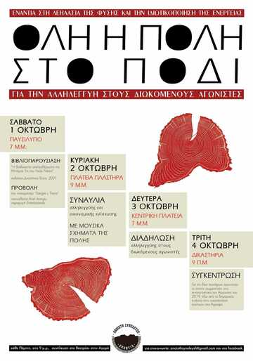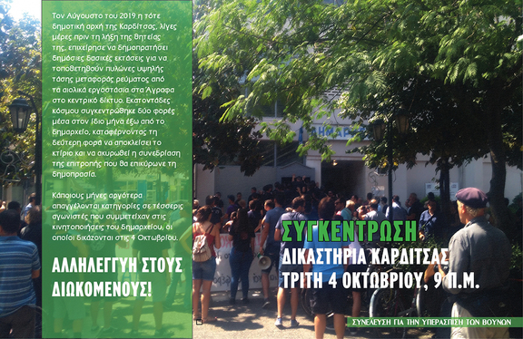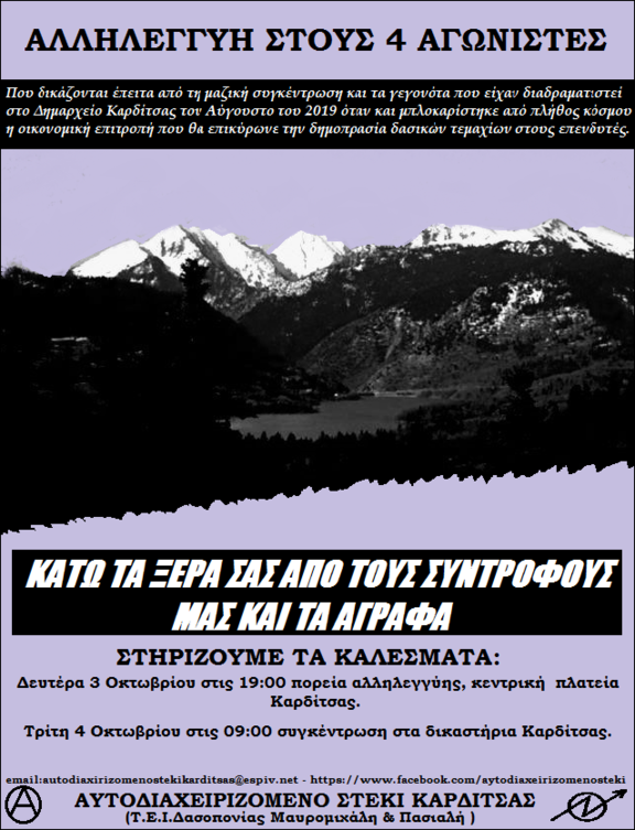 Τρίτη 4 Οκτωβρίου: 9.00 π.μ.δικαστήρια Καρδίτσας, συγκέντρωση για τη δίκη τεσσάρων αγωνιστών που συμμετείχαν στη συγκέντρωση στο Δημαρχείο Καρδίτσας ενάντια στη δημοπρασία δημοτικών δασικών τεμαχίων.
