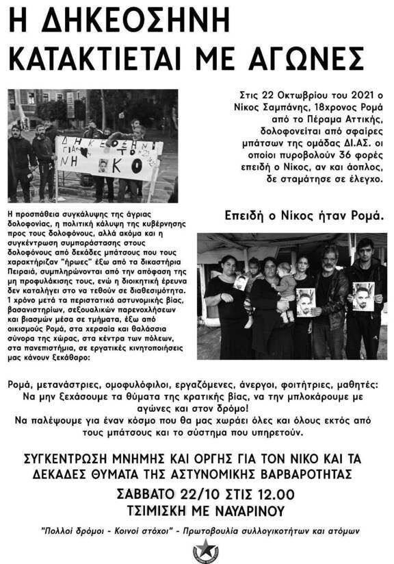 Στις 22 Οκτωβρίου του 2021 ο Νίκος Σαμπάνης, 18χρονος Ρομά από το Πέραμα Αττικής, δολοφονείται από σφαίρες μπάτσων της ομάδας ΔΙ.ΑΣ. οι οποίοι πυροβολούν 36 φορές επειδή ο Νίκος, αν και άοπλος, δε σταμάτησε σε έλεγχο.