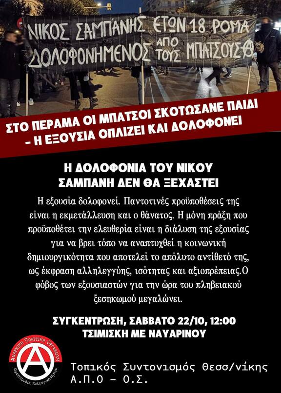 Συγκέντρωση μνήμης και οργής για την κρατική δολοφονία του Νίκου Σαμπάνη | Σάββατο 22/10, 12:00, Τσιμισκή με Ναυαρίνου