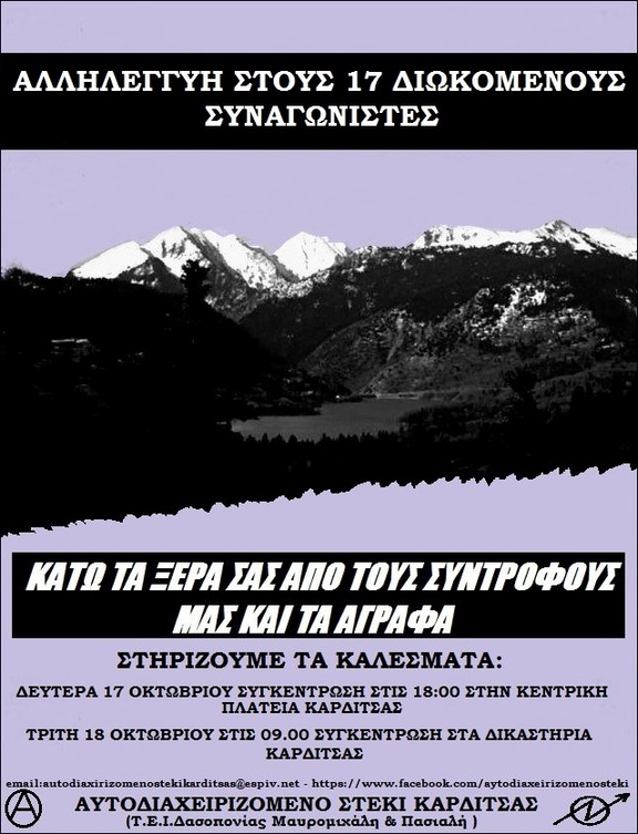 Συγκέντρωση Αλληλεγγύης την Τρίτη 18 Οκτωβρίου στις 09.00 στα Δικαστήρια Καρδίτσας.