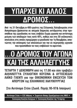 Από τις 31 Οκτώβρη οι 400 εργάτες της Ελληνικής Χαλυβουργίας στον Ασπρόπυργο βρίσκονται σε απεργία διαρκείας αντιδρώντας στην προσπάθεια της εργοδοσίας να τους επιβάλει 5ώρη εργασία και αντίστοιχη μείωση των αποδοχών τους κατά 40%, καθώς και στις 50 εκδικητικές απολύσεις στις οποίες προχώρησε η εργοδοσία την 1η Νοεμβρίου., απαιτώντας την απόσυρση των απολύσεων και τις εκ' περιτροπής εργασία που προσπαθούν να τους επιβάλουν τα αφεντικά.