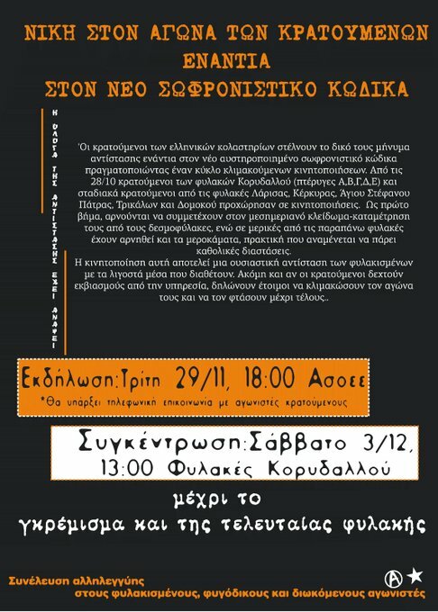 Οι κρατούμενοι των ελληνικών κολαστηρίων στέλνουν το δικό τους μήνυμα αντίστασης ενάντια στον νέο αυστηροποιημένο σωφρονιστικό κώδικα πραγματοποιώντας έναν κύκλο κλιμακούμενων κινητοποιήσεων. Άλλωστε, δεν είναι η πρώτη φορά που οι φυλακισμένοι εξεγείρονται απέναντι στον ΣΚ με αντίστοιχες κινητοποιήσεις να παίρνουν μεγάλες διαστάσεις και να κερδίζονται με αίμα, όπως στις εξεγέρσεις στις φυλακές Μαλανδρίνου το 2007, την απεργία πείνας των πολιτικών κρατουμένων το 2008, την μαζική απεργία πείνας των πολιτικών κρατουμένων το 2015 αλλά και πιο πρόσφατα κατά την διετία 2017-18 στις φυλακές Κορυδαλλού και την εξεγερτική κινητοποίηση στην Θήβα κατά την περίοδο της πανδημίας.