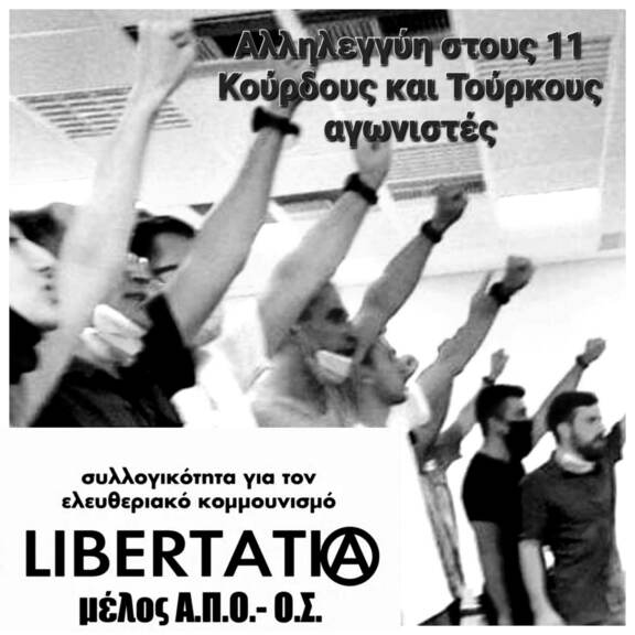 Απαιτούμε την άμεση αποφυλάκιση των 11 συλληφθέντων Τούρκων και Κούρδων αγωνιστών από το ελληνικό κράτος, το οποίο πλάι στο τουρκικό χτυπά και εξοντώνει αγωνιστές. Εκφράζουμε την αλληλεγγύη μας τόσο σε αυτούς όσο και σε όσους αντιστέκονται ακηδεμόνευτα στη ζοφερή πραγματικότητα που επιβάλλουν οι εξουσιαστές αυτού του κόσμου.