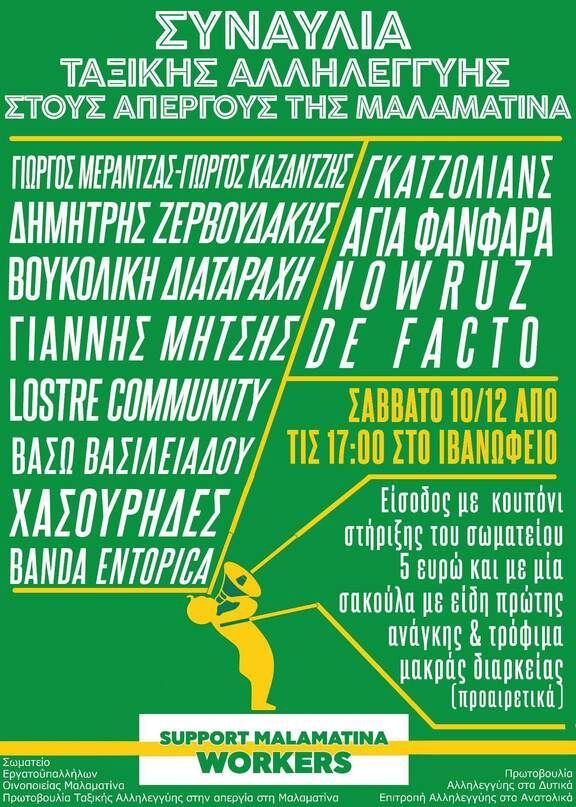 Η εθελοντική και συνειδητή συμμετοχή των μουσικών και των σχημάτων τους οποίους και ευχαριστούμε για την άμεση ανταπόκρισή τους, αλλά και των δεκάδων ανθρώπων των επιτροπών αλληλεγγύης, των κοινωνικών/ πολιτικών πρωτοβουλιών και των εργατικών σωματείων της πόλης που ήδη εμπλέκονται στη διοργάνωση της συναυλίας αντανακλά τη σημασία του ίδιου του αγώνα των απεργών στη Μαλαματίνα.