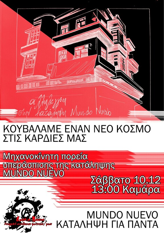 [...]Ναι, ασφαλώς είχαμε και έχουμε πάντα έναν καινούργιο κόσμο στις καρδιές μας, αλλά δεν βρίσκεται μονάχα εκεί. Αλλά σε όσα έχουμε φτιάξει ήδη, σε όσα έχουν ήδη δημιουργηθεί και πάρει τον δρόμο τους μέσα στο απέραντο ποτάμι της ορμητικής ελευθερίας που ονομάζουμε Αναρχία. Νέοι και παλιοί σύντροφοι και συντρόφισσες συνεχίζουν αδιάκοπα την πάλη και αυτό θα συνεχίσουμε να κάνουμε κι εμείς ασφαλώς. Πρώτα και κύρια διεκδικώντας πίσω τη Mundo Nuevo. Ο αγώνας για την ανάκτηση μόλις έχει αρχίσει και καλούμε όλο το κίνημα πανελλαδικά αλλά και στο εξωτερικό να στηρίξει αυτήν την υπόθεση, γιατί δεν αφορά μόνο εμάς αλλά ολόκληρο το ριζοσπαστικό, αναρχικό και καταληψιακό κίνημα.